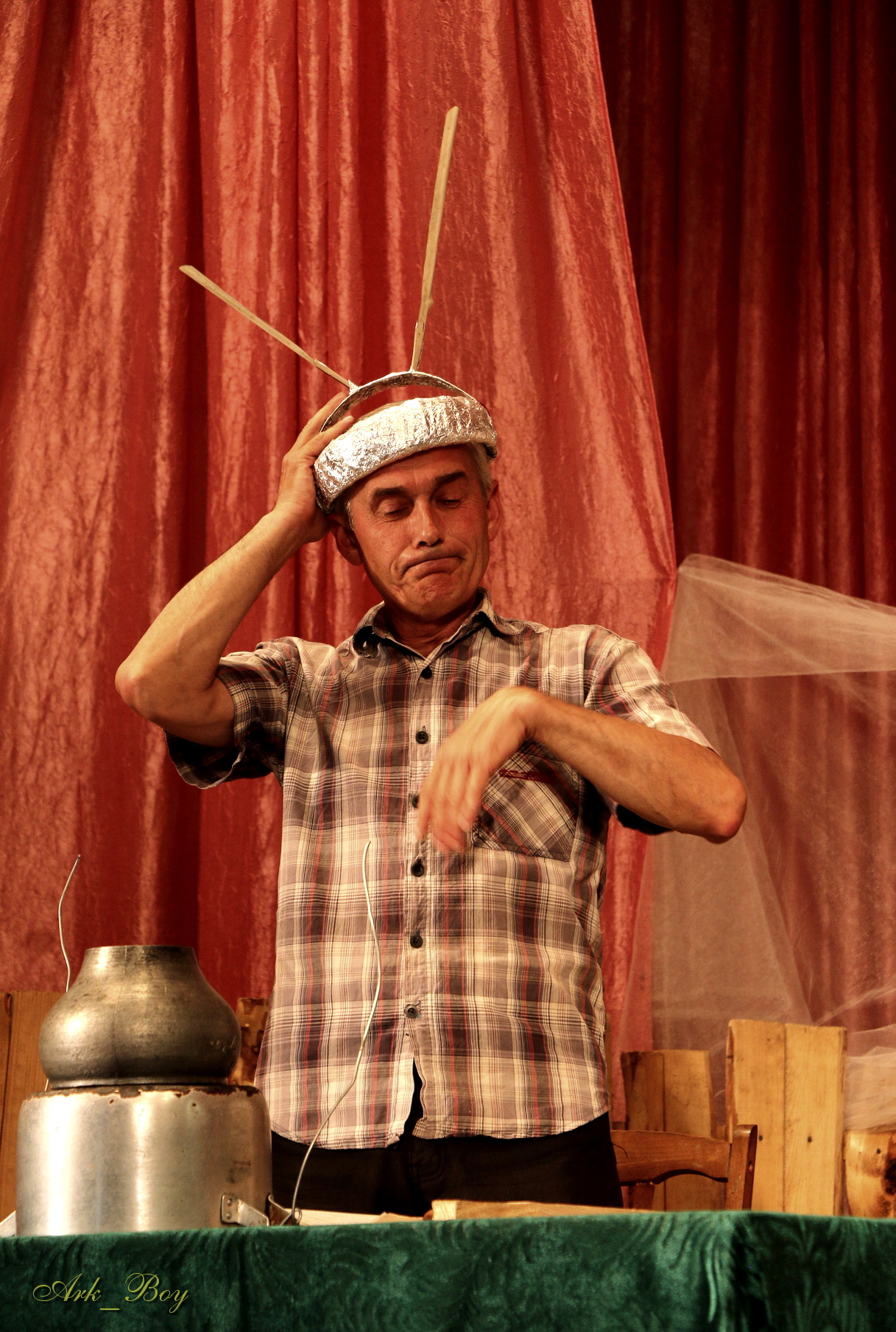 Цьому сприяла і вдала режисура, і артистизм акторів, і кумедний сюжет. Юрко (Арсен Іщук) – синок-студент Павла (Олександр Лістовський) та Катерини (Ольга Мороз) придумав апарата, який читає думки всіх, хто натягає обруча на голову. Навколо цього відбуваються всі події в комедії.