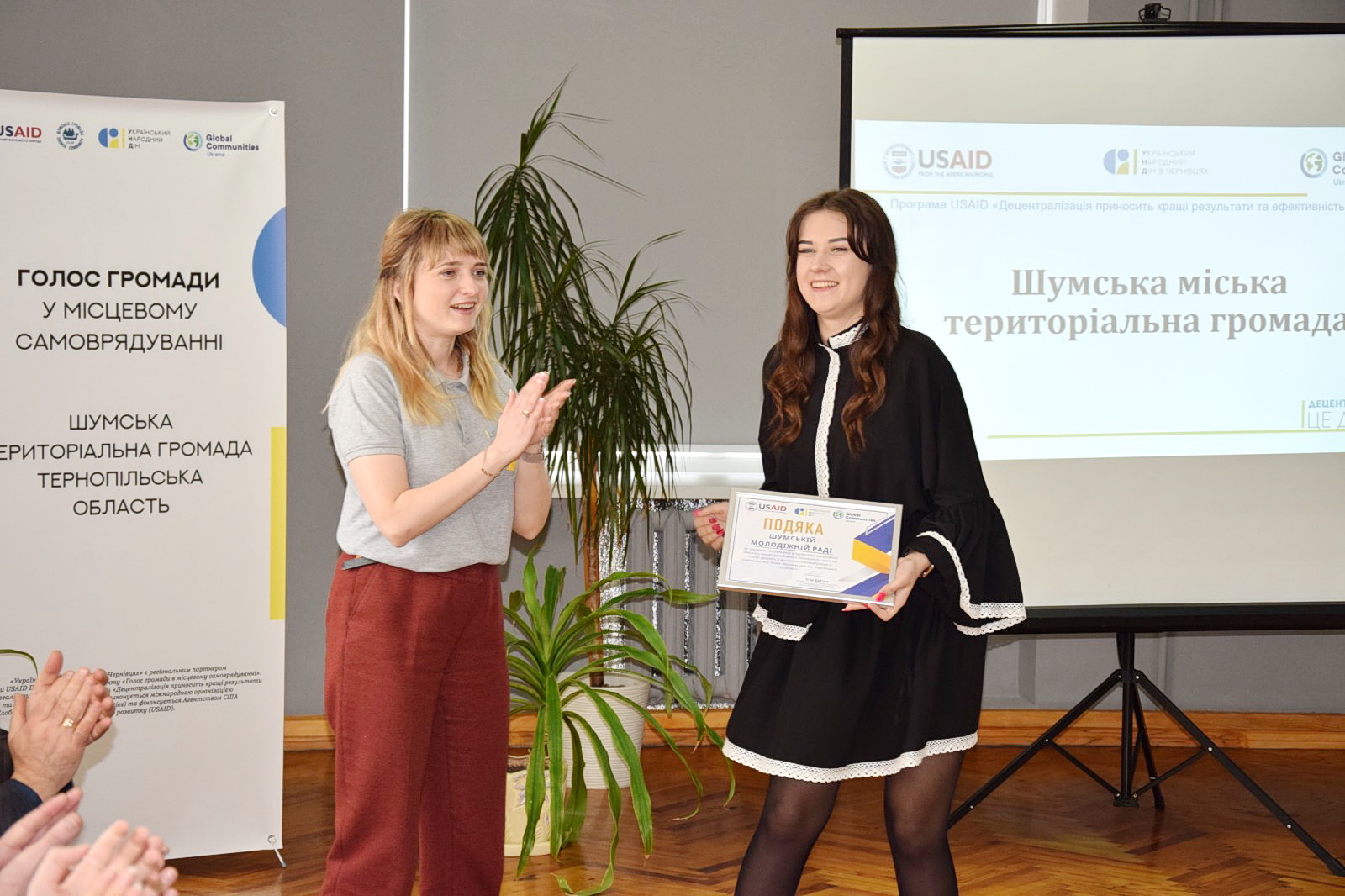 Представниця проєкту «Голос громади в місцевому самоврядуванні в Івано-Франківській, Тернопільській та Чернівецькій областях» Тетяна Мосін закликала учасників співпрацювати та обмінюватися досвідом у реалізації молодіжної політики та вручила подяку голові Молодіжної ради Анастасії Соловей.