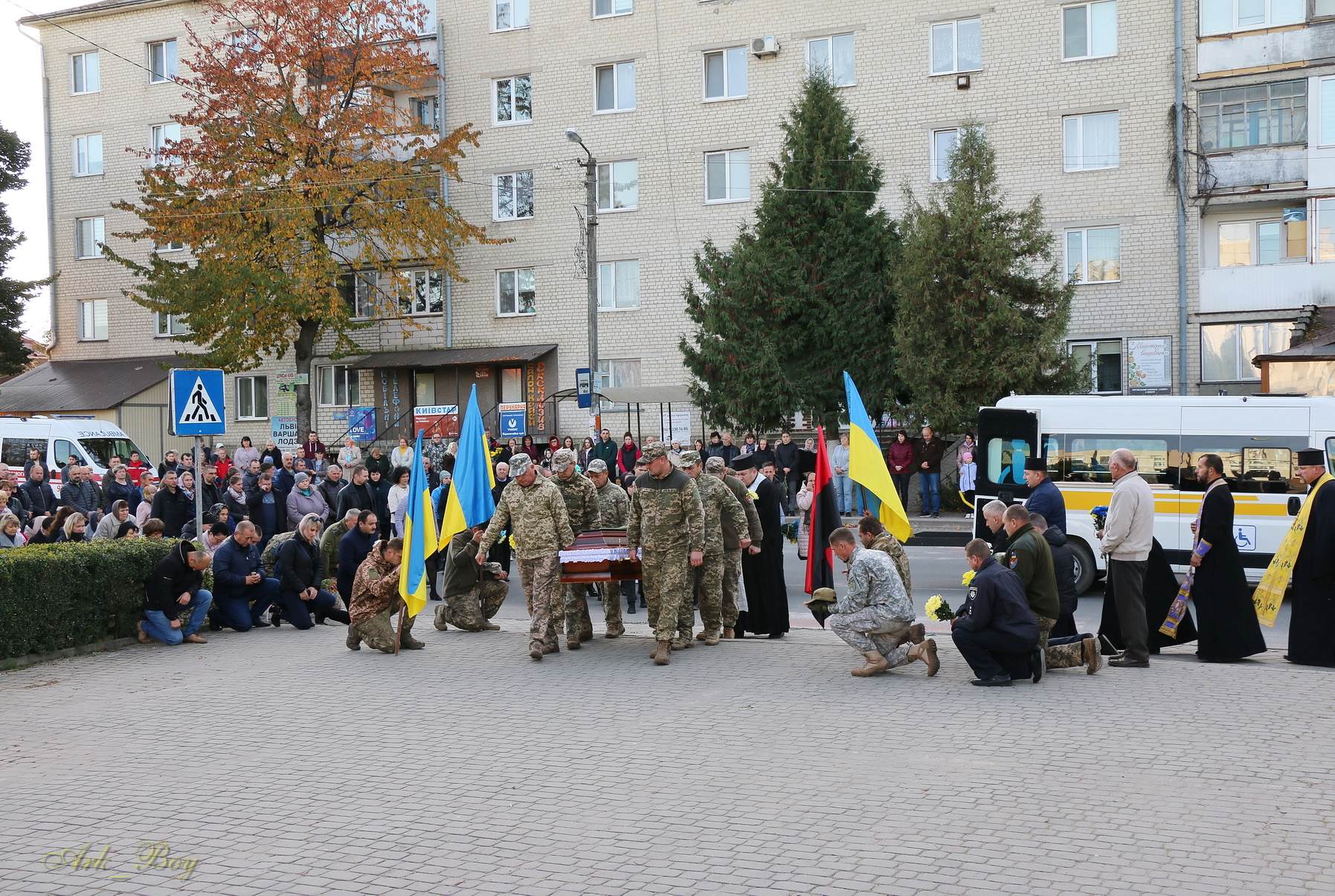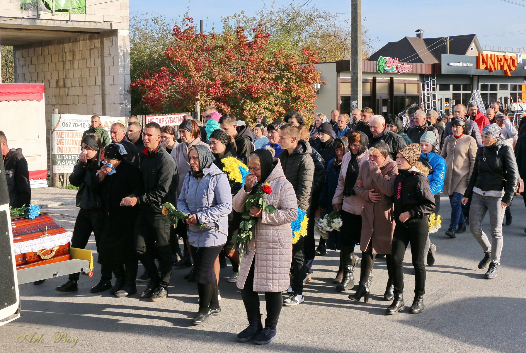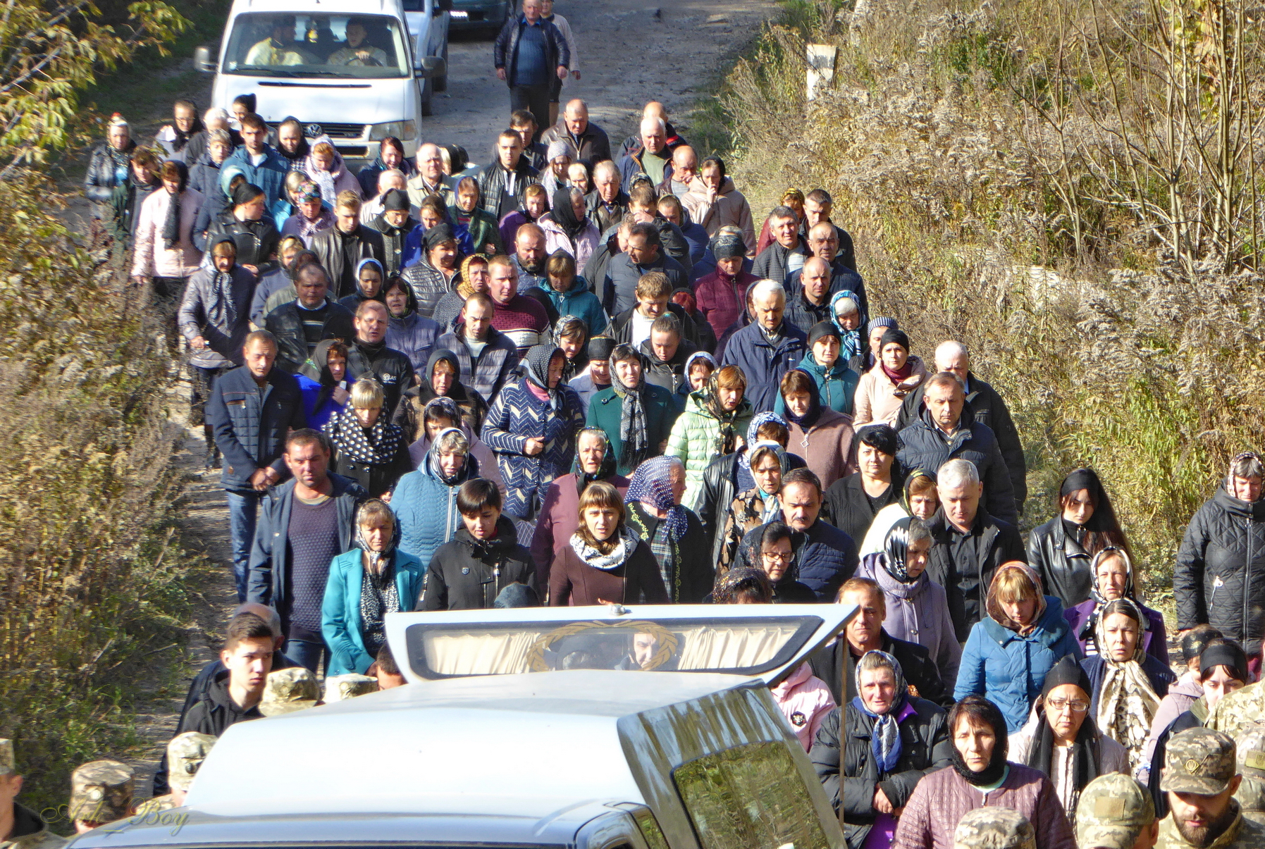 Навколішки, обабіч дороги з квітами та лампадками на загиблого Героя чекали сотні земляків.