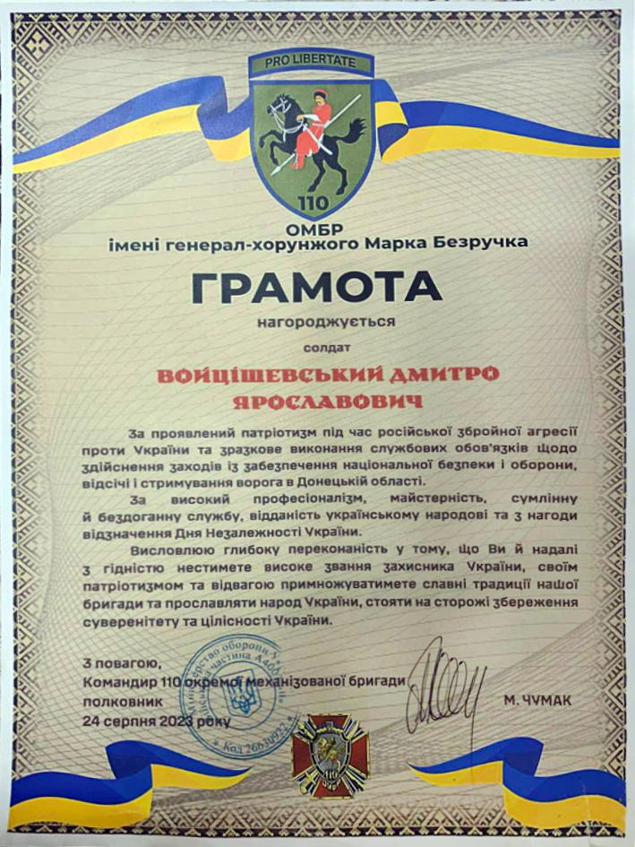 Дмитро був відважним захисником. Про це свідчать грамота від командування 110 окремої механізованої бригади імені генерал-хорунжого Марка Безручка та Президентська відзнака «За оборону України».
